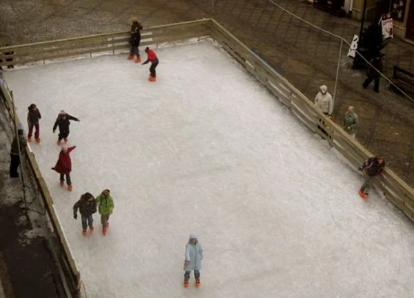 Lodowisko sezonowe w Kłodzku na Rynku wykonane w technologii orurowania aluminiowego.