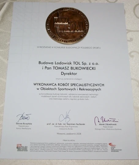 W tym roku już drugi raz wykonaliśmy w Spale lodowisko w technologii orurowania aluminiowego. Lodowisko zostało zbudowane przy pełnym słońcu i temperaturze +18°C. Jednocześnie podczas tegorocznego Kongresu Infrastruktury Sportowej w Spale, otrzymaliśmy medal w IX edycji Konkursu Firma Na Medal w kategorii Wykonawca Robót Specjalistycznych w Obiektach Sportowych i Rekreacyjnych, za kompleksową budowę lodowisk oraz wdrażanie nowoczesnych technologii.