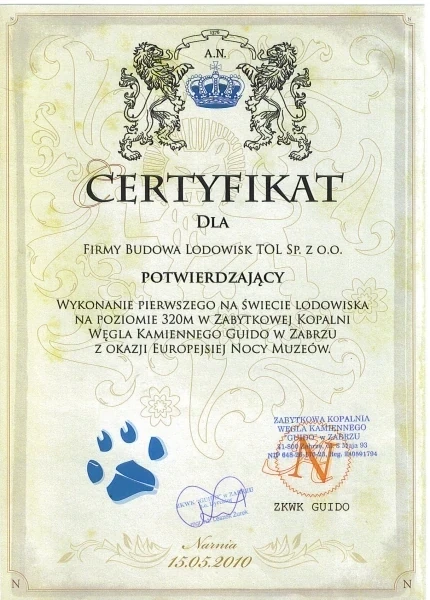 Jednym z najciekawszych miejsc do zwiedzania na mapie Szlaku Zabytków Techniki Województwa Śląskiego jest Kopalnia Węgla Kamiennego „Guido” w Zabrzu, która istnieje od 1855 r. Nietypowa lokalizacja lodowiska i wyjątkowa noc – w połowie maja – podsunęła pomysł wykonania tafli w formie „Zamarzniętego jeziora”. Przy realizacji budowy lodowiska w podziemiach kopalni należało rozwiązać kilka problemów nie występujących na powierzchni. Jeszcze raz technologia mrożenia tafli lodowiska oparta na aluminium potwierdziła swoje zalety: bardzo wysoką przewodność cieplną, wytrzymałość, a także łatwość montażu i obsługi. Montaż lodowiska trwał dwa dni, a jego obsługą, wraz z wypożyczalnią łyżew, zajmował się tylko jeden pracownik.